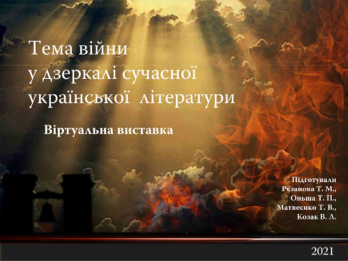 Пропонуємо Вашій увазі віртуальну виставку «Тема війни у дзеркалі сучасної української літератури». Період Другої світової та Великої вітчизняної воєн – один з найбільш драматичних періодів історії України. В останнє десятиліття в Україні з’явився цілий історіографічний пласт, пов’язаний з історією Другої світової війни. Виконані в різних жанрах, ці видання віддзеркалюють нинішній стан наукових досліджень та творів художньої літератури у даній тематиці.