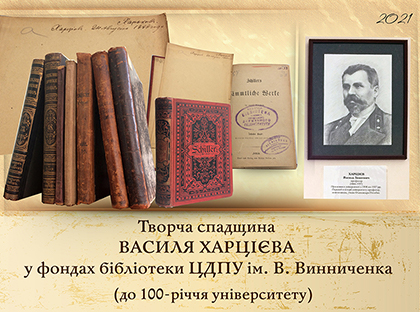 До уваги користувачів бібліотеки – твори талановитого просвітителя, вченого-філолога, педагога й організатора освітянської справи Василя Івановича Харцієва, а також дослідження, присвячені життю та діяльності вченого, які знаходяться в рідкісному фонді та читальному залі № 1 бібліотеки ЦДПУ ім. В. Винниченка і в мережі Інтернет.
