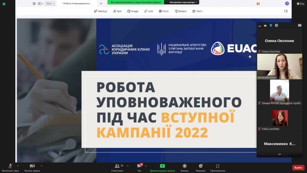 16 червня 2022 року відбулось онлайн навчання уповноважених осіб з питань запобігання корупції. Дана зустріч відбулась завдяки співпраці Національного агентства з питань запобігання корупції, Асоціації юридичних клінік України а також EUREAN UNION ANTI-CORRUPTION INITIATIVE.