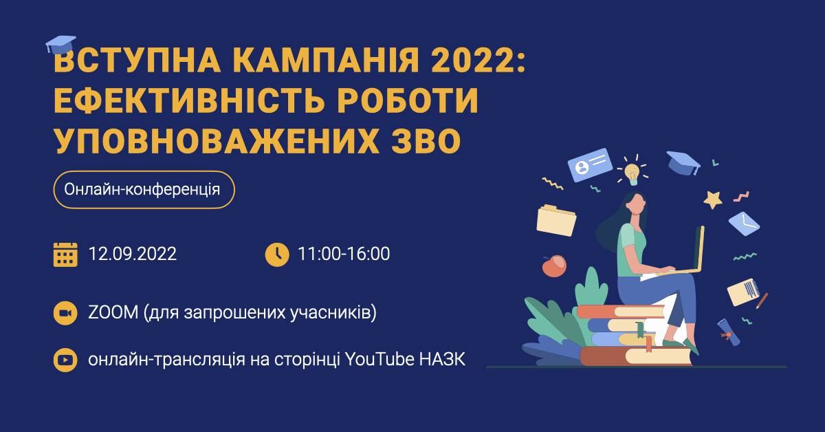 12 вересня 2022 року Національне агентство з питань запобігання корупції провело для антикорупційних уповноважених закладів вищої освіти онлайн-конференцію «Вступна кампанія 2022: ефективність роботи уповноважених закладів вищої освіти (ЗВО)».