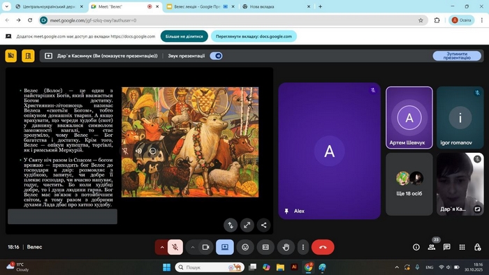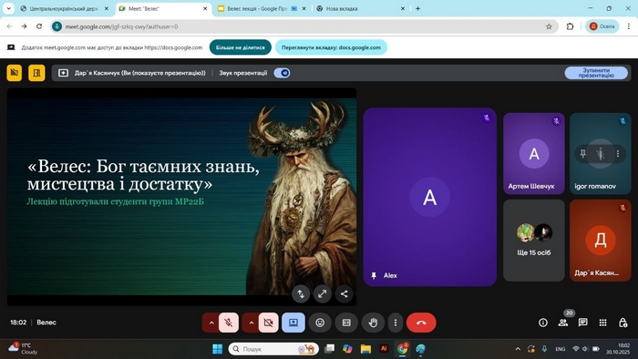 30 жовтня о 18:00 відбулася відкрита інтерактивна онлайн лекція “Велес: Бог таємних знань, мистецтва і достатку”, яку підготували та провели студенти -художники 4 курсу спеціальностей 023 Образотворче мистецтво, декоративне мистецтво та реставрація та 014 Середня освіта (Образотворче мистецтво) в межах курсу «Менеджмент в мистецтві».