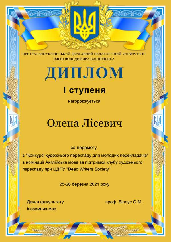 1 місце - Олена Лісевич (випускниця факультету іноземних мов ЦДПУ, м.Кропивницький)
