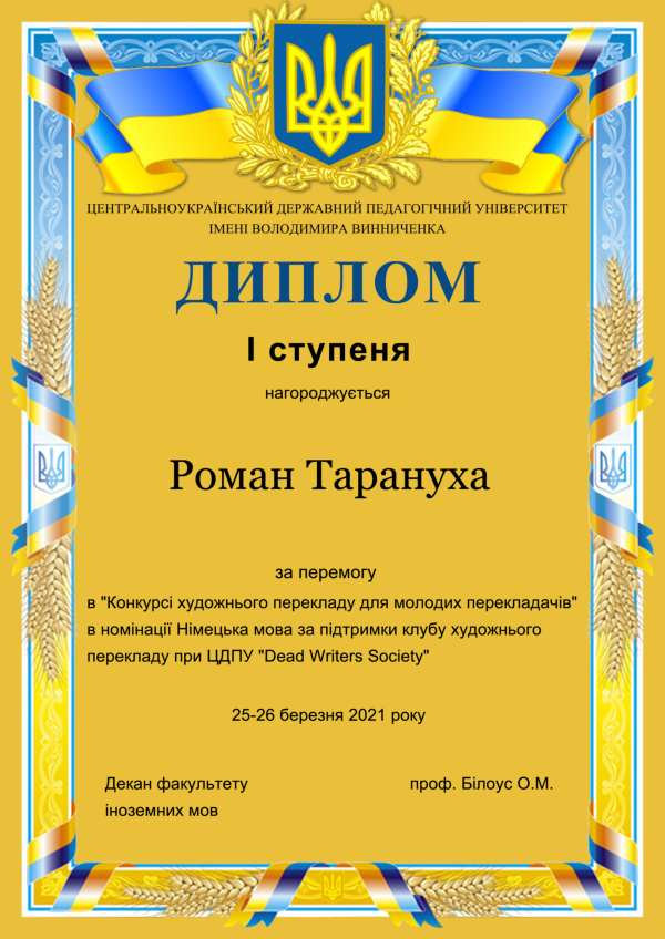 1 місце - Роман Тарануха (Центральноукраїнський державний педагогічний університеті мені Володимира Винниченка)