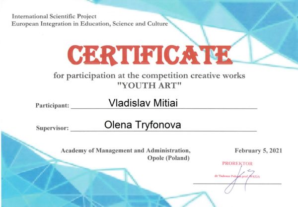 2021 рік розпочався участю в міжнародному конкурсі творчих робіт «Youth Art» в рамках реалізації Міжнародного наукового проекту «Євроінтеграція в освіті, науці і культурі», м.Ополє (Польща).