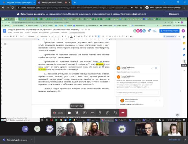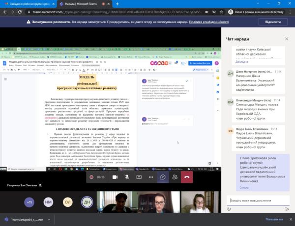 17 лютого 2022 року відбулося засідання робочої групи МОНУ з розроблення моделі регіональної (територіальної) програми науково-технічного розвитку та рекомендацій щодо подальшого впровадження її в регіонах України. Участь в онлайн-нараді взяла голова РМВ ЦДПУ Олена Трифонова (член робочої групи наказу Міністерства освіти і науки України від «26» серпня 2021 р. № 935).