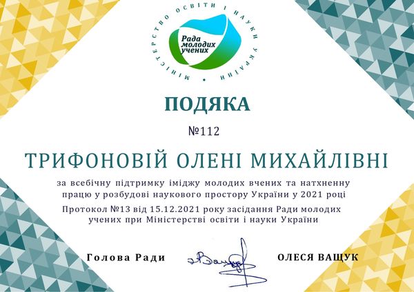 Також підсумовуючи результати діяльності РМВ за 2022 рік було оголошено подяки. Зокрема, голові РМВ Центральноукраїнського державного університету імені Володимира Винниченка, доктору педагогічних наук Олені Трифоновій на підставі рішення Ради молодих учених при Міністерстві освіти і науки України висловлено подяку за всебічну підтримку іміджу молодих вчених, натхненну працю з розбудови наукового простору України в 2021 році.