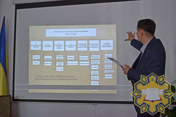 Кандидат наук із соціальних комунікацій, старший викладач кафедри журналістики, видавничої справи та редагування Центральноукраїнського державного педагогічного університету ім.В.Винниченка Роман Базака під час свого виступу розкрив основний зміст монографії, яка присвячена комплексному дослідженню періодичної преси Кіровоградщини (1874–1921 рр.), передумов її зародження та розвитку. Проаналізовано особливості функціонування видань у забезпеченні інформаційних потреб краю. З’ясовано умови формування типологічних груп та становлення специфічної типологічної моделі регіональної періодики на тлі соціально-економічних, духовних, національно-культурних і суспільно-політичних подій. Особливу увагу приділено аналізу ідейно-політичного дискурсу преси Кіровоградщини періоду національно-визвольних змагань.
