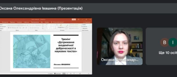 Практичний тренінг «Дотримання академічної доброчесності в наукових текстах» провела випускниця ОНП, доктор філософії Оксана Олександрівна Івашина. Здобувачі дізналися більше про правила цитування у фахових публікаціях, переваги й недоліки допомоги штучного інтелекту, специфіку використання інтернет-джерел та праць на паперових носіях.