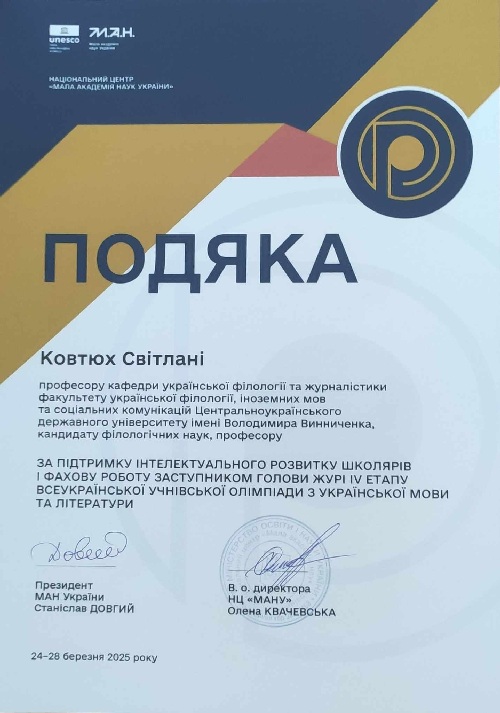 С. Л. Ковтюх – заступник голови журі IV етапу Всеукраїнської учнівської олімпіади з української мови та літератури