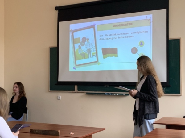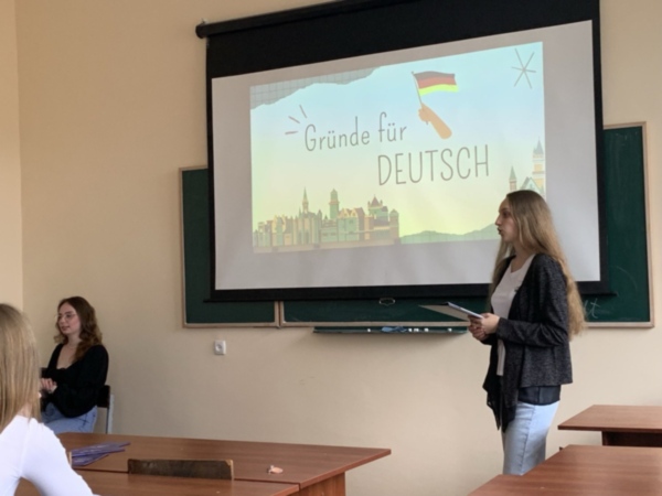 Цього разу до участі долучилися й викладачі секції німецької мови, доценти Тетяна Токарєва та Тетяна Хоменко. Разом зі студентами ІІІ курсу вони підготували частину загального заходу, яка стосувалася вивчення німецької мови. Студентки групи АН21Б (302) Дар’я Літвінчук та Оксана Коркіш продемонстрували презентацію «Gründe für Deutsch» («Чому слід вивчати німецьку мову»). У доступній формі, з використанням відповідних наочних матеріалів, присутні могли отримати всеохоплюючу інформацію щодо можливостей, які відкриває володіння німецькою мовою (подорожі до німецькомовних країн, розширення можливостей та кола спілкування, саморозвиток особистості, можливість долучитися до культурних надбань німецькомовних країн, знайомство з науковими досягненнями тощо). Сподіватимемося, що мотивація присутніх до вивчення німецької мови була активована!