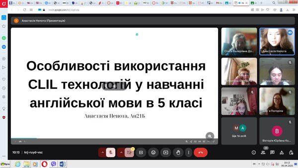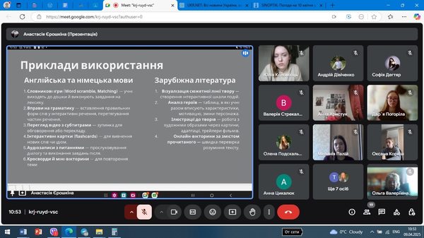 9 квітня 2025 року на кафедрі германських мов, зарубіжної літератури та методик їхнього навчання було підведено підсумки виробничої практики студентів бакалаврських освітніх програм «Мова і література (англійська)» та «Мова і література (англійська та німецька)» у формі звітної конференції за участі методистів та здобувачів 4 курсу денної та заочної форм навчання. Методисти фахових дисциплін виступили з оцінкою якості проведення студентами уроків й позакласних заходів з англійської та німецької мов і зарубіжної літератури, ведення поточної та звітної документації та узагальнили набуті студентами під час практики програмні результати навчання.