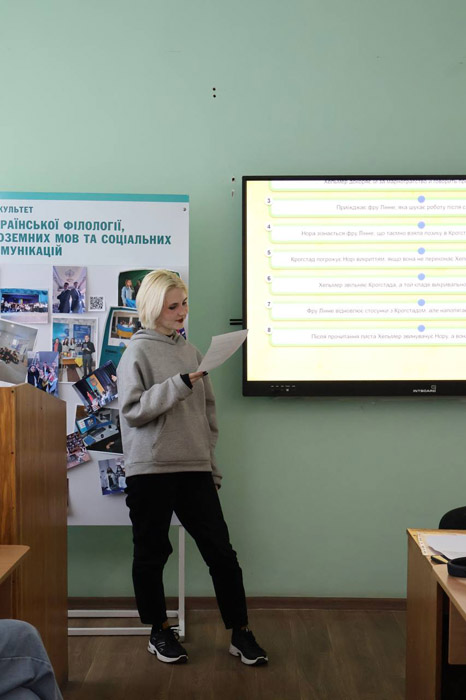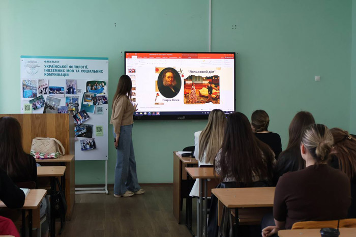 Напередодні тижня факультету української філології, іноземних мов та соціальних комунікацій та дня самоврядування, на кафедрі германських мов, зарубіжної літератури та методик їхнього навчання проведено заняття, де самі студенти керували навчальним процесом. 29 квітня Дар’я Літвінчук, студентка групи АН21Б, креативно, цікаво й професійно провела заняття із зарубіжної літератури для студентів інших курсів - групам УА21Б, АН22Б та АН24Б. Це заняття стало глибокою розмовою про рівність, вибір і право бути почутим. У центрі — п’єса Генріка Ібсена «Ляльковий дім» — не просто літературний твір, а голос за рівність, що й сьогодні звучить по-особливому гостро.
