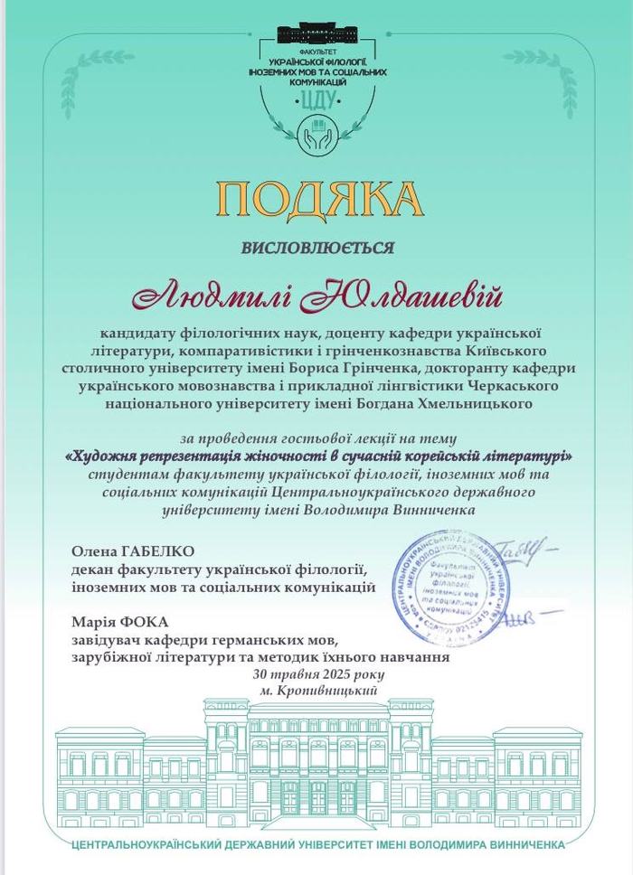 30 травня на факультеті української філології, іноземних мов та соціальних комунікацій, на запрошення кафедри германських мов, зарубіжної літератури та методик їхнього навчання, кандидат філологічних наук, доцент кафедри української літератури, компаративістики і грінченкознавства Київського столичного університету імені Бориса Грінченка, докторант кафедри українського мовознавства і прикладної лінгвістики Черкаського національного університету імені Богдана Хмельницького Людмила Юлдашева прочитала гостьову лекцію на тему «Художня репрезентація жіночності в сучасній корейській літературі». Лекцію відвідали студенти спеціальностей А4 Середня освіта та B11 Філологія першого (бакалаврського) і другого (магістерського) рівнів, що вивчають зарубіжну літературу.