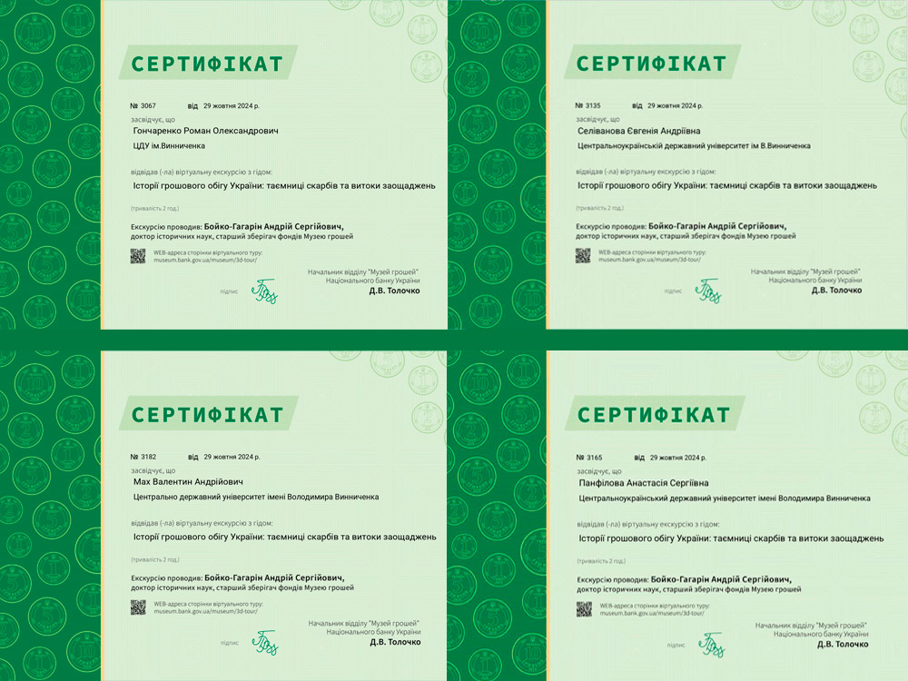 В рамках вивчення освітнього компоненту 12 «Макро- та мікроекономіка» доцент кафедри менеджменту та підприємництва Оксана Буткевич кожного останнього вівторка місяця ініціює серед студентів груп ЕК24Б,та МЛ 24Б спеціальностей 051 Економіка ОП Економічна безпека та 073 Менеджмент ОП Логістика ЦДУ ім. В. Винниченка долучатись до проведення Музеєм грошей Спеціального віртуального туру для студентів та молоді з теми «Історії грошового обігу України: таємниці скарбів та витоки заощаджень» із отриманням сертифікату.