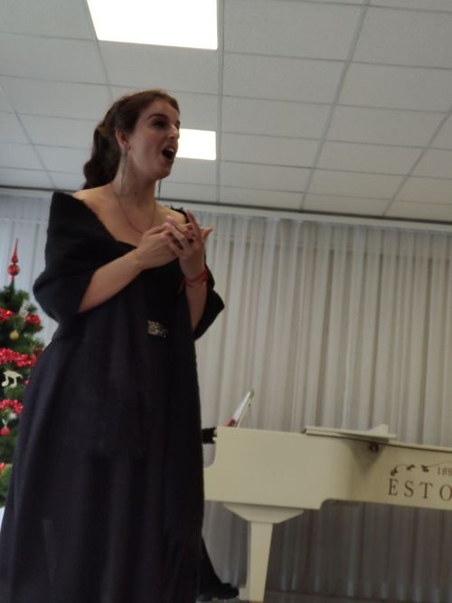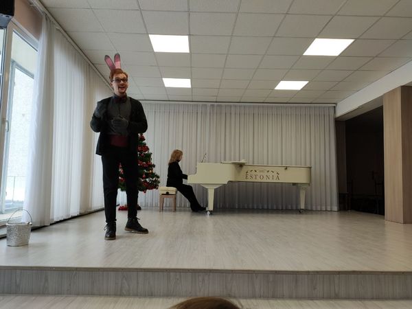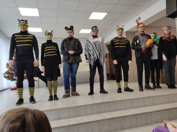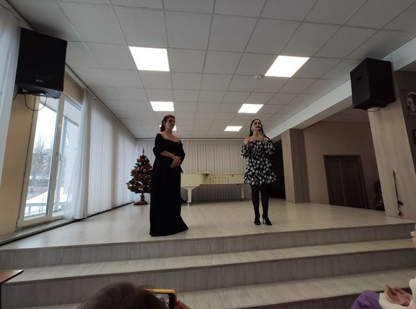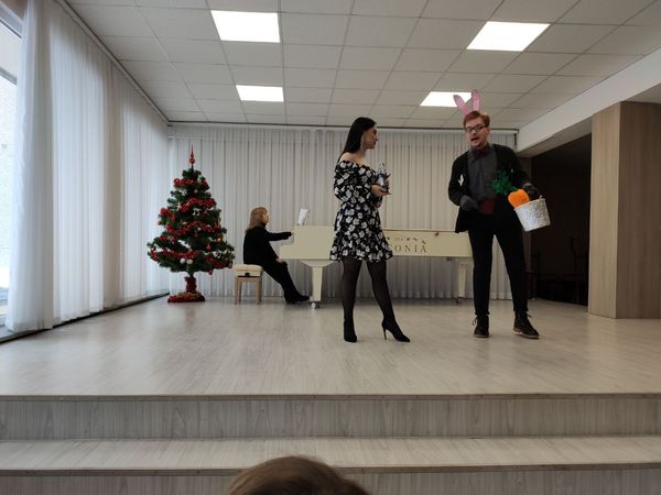 Слід також визначити й доречність невеличкого концерту, який відбувся на сцені актової зали перед виставою й налаштував глядачів на сприймання видовища. Його учасниками стали А. Зінченко (викл. – доц. І.Л. Шевченко) та М. Циганок (викл. – С. О. Сметана), А. Кононенко (викл. – доц. С.В. Кулікова), дует у складі А. Матуляк та А. Усік, М. Заставнюк (викл. – народний артист України С.П. Дьомін), а також К. Царенко. Зважаючи на початок зимових свят, музичні дарунки від співаків та інструменталістів з вдячністю були сприйняті глядачами. Останнім акордом заходу став виступ студентського хорового колективу під керівництвом доц. М.П. Назаренко, які привітали присутніх колядкою «Будьте здорові).