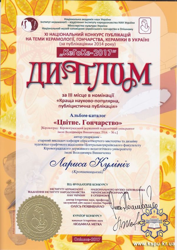 25 травня 2017 року у Національному музеї-заповіднику українського гончарства в Опішному відбулася Церемонія офіційного оголошення результатів і нагородження переможців ХІ Національного конкурсу публікацій на теми керамології, кераміки, гончарства в Україні «КеГоКе-2017» (за публікаціями 2014 року).