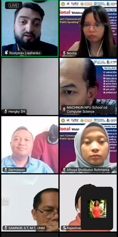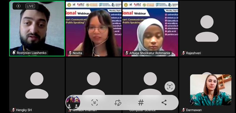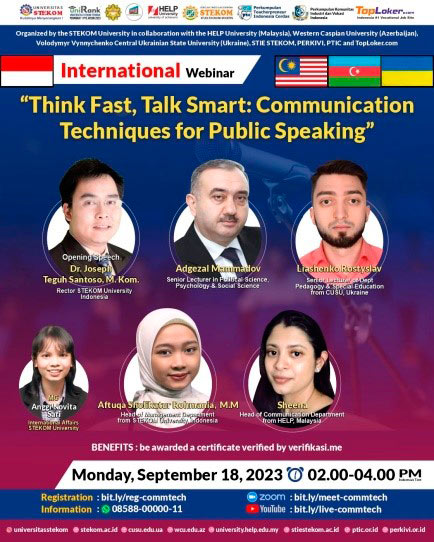 18 вересня 2023 року на базі Університету комп’ютерних наук і технологій STEKOM (Семаранг, Центральна Ява, Індонезія) у співпраці з Центральноукраїнським державним університетом імені В.Винниченка (Україна), Університетом HELP (Малайзія), Західно-Каспійським університетом (Азербайджан), Асоціацією промислових та професійних громад (PERKIVI) та Індонезійською асоціацією вчителів (PTIC) пройшов міжнародний онлайн-вебінар «Think Fast, Talk Smart: Communication Techniques for Public Speaking» (Техніка спілкування під час публічних виступів).