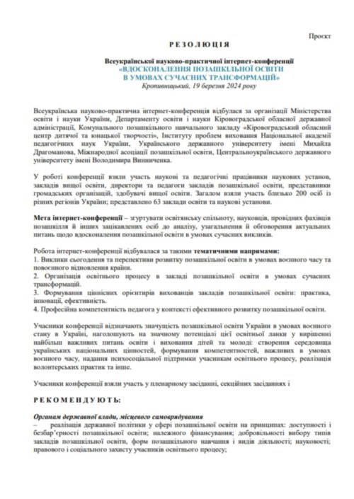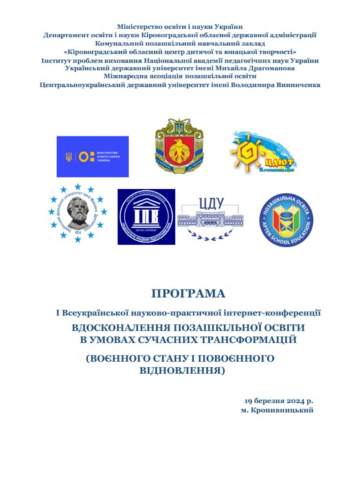 19 березня 2024 року під егідою Міністерства освіти і науки України та Департаменту освіти і науки Кіровоградської обласної державної адміністрації відбулася Всеукраїнська науково-практична інтернет-конференція «Вдосконалення позашкільної освіти в умовах сучасних трансформацій», яка започаткована Кіровоградським обласним центром дитячої та юнацької творчості. Співорганізаторами конференції виступили: Інститут проблем виховання національної академії педагогічних наук України, Український державний університет імені Михайла Драгоманова, Міжнародна асоціація позашкільної освіти, Центральноукраїнський державний університет імені Володимира Винниченка.