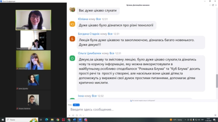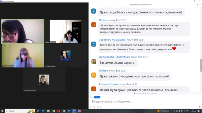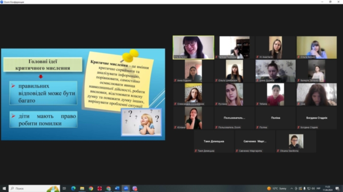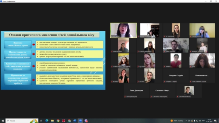 11 квітня 2024 р. на платформі Zoom в межах співробітництва між закладами проведено гостьову кандидаткою педагогічних наук, доценткою, доценткою кафедри дошкільної і початкової освіти Сумського державного педагогічного університету Бутенко Вітою Григорівною на тему «Технології розвитку основ критичного мислення в роботі з дітьми дошкільного віку» для здобувачів спеціальності 012 Дошкільна освіта першого (бакалаврського) рівня та другого (магістерського) рівня.