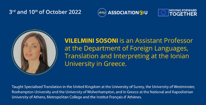 жовтень 2022 – Vilelmini Sosoni, an Assistant Professor at the Department of Foreign Languages, Translation and Interpreting at the Ionian University in Greece. Vilelmini holds an MA in Translation and a PhD in Translation and Text Linguistics from the University of Surrey. Her research interests lie in the areas of the Translation of Institutional and Political Texts, Corpus Linguistics, Audiovisual Translation and Accessibility, as well as Machine Translation and Cognitive Science: лекції “Translating EU texts: From legal acts to subtitles and marketing texts”, “Translation Technology to the service of translators with a focus on MTPE”, “EU terminology and translation”.