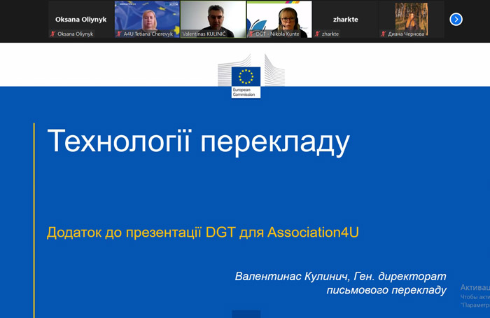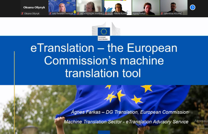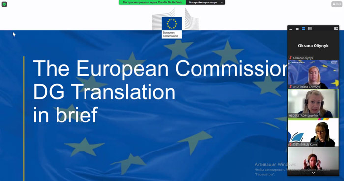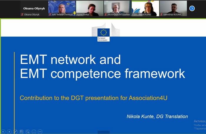 2. 26.04.2023 – онлайн-зустріч студентів і викладачів із представниками Генерального директорату з письмового перекладу Європейської Комісії. Спікери представили детальний огляд структури та завдань DG Translation, функціоналу eTranslation і найсучасніших технологій перекладу, а також розповіли про переваги участі ЗВО в EMT (European Master's in Translation) – партнерському проєкті між Європейською Комісією та вищими навчальними закладами та рамку компетенцій EMT.