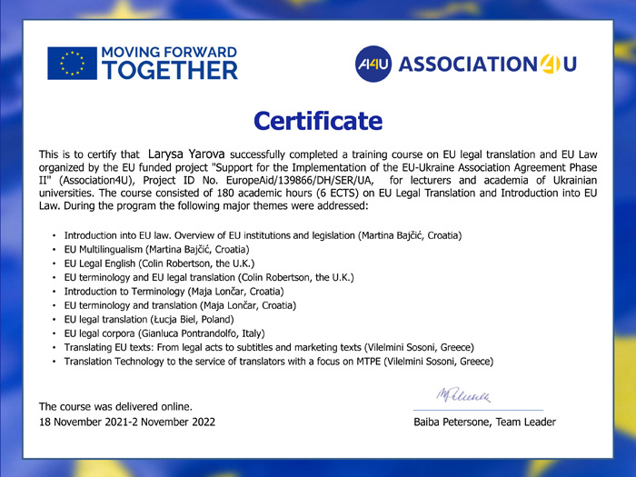 - За результатами співпраці викладачі кафедри, які успішно завершили онлайн-курс тривалістю 180 академічних годин (6 ECTS) із юридичного перекладу ЄС та вступу до права ЄС, а саме Лариса Ярова, Оксана Олійник, Богдан Стасюк і Марина Тарнавська, отримали офіційні сертифікати проєкту Association4U (EuropeAid/139866/DH/SER/UA). ECTS). Звіт про підвищення кваліфікації затверджено наказом ректора ЦДПУ ім. В. Винниченка № 3-УН від 04.01.2023 року.
