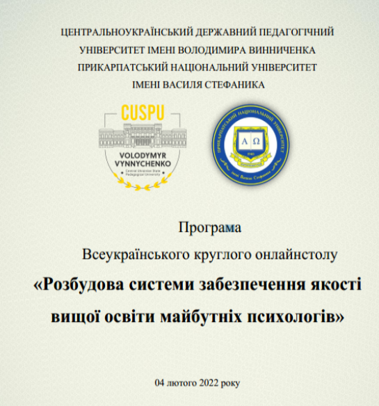 4 лютого 2022 р. в онлайн-режимі відбувся Всеукраїнський круглий стіл «Розбудова системи забезпечення якості вищої освіти майбутніх психологів», присвячений обговоренню актуальних проблем та обміну досвідом щодо розвитку й ефективного використання доробків у навчально-виховному процесі підготовки майбутніх психологів. Ініціатором його проведення виступила кафедра психології факультету педагогіки, психології та мистецтва Центральноукраїнського державного педагогічного університету імені Володимира Винниченка. Співорганізатори заходу – кафедра психології розвитку факультету психології Прикарпатського національного університету імені Василя Стефаника.