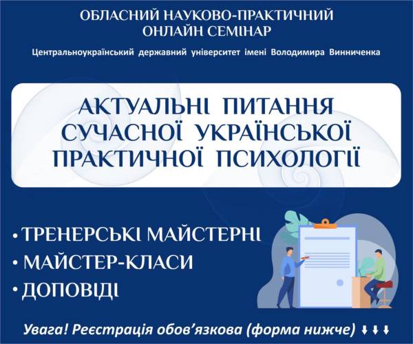 Організаційний комітет запрошує вас взяти участь у обласному науково-практичному онлайн-семінарі «Актуальні питання сучасної української практичної психології», який відбудеться 23 грудня 2022 року на базі кафедри психології та соціальної роботи Центральноукраїнського державного університету імені Володимира Винниченка.