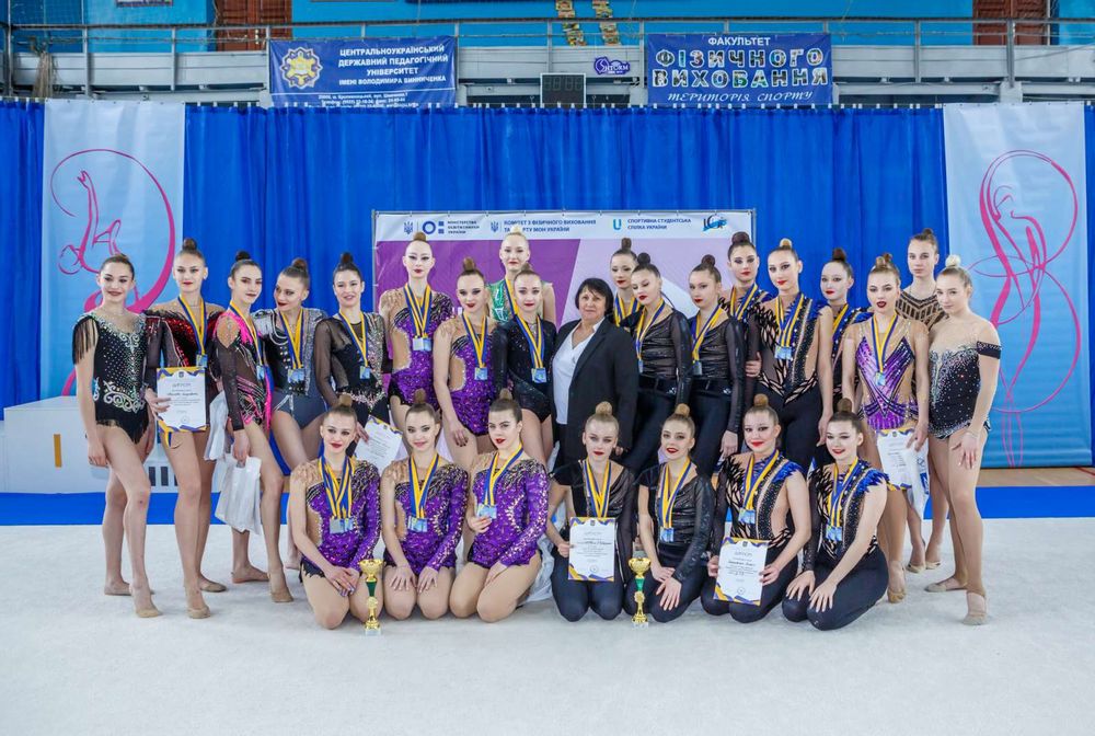 В командному заліку групових вправ наша команда посіла 1 місце (студентки факультету фізичного виховання, майстри спорту України: Анна Нестеренко – 3 курс, Дар’я Кучеренко – 2 курс, Ангеліна Сізова – 2 курс, Єва Кишлян – 1 курс, Анастасія Карлова – 1 курс, Дар’я Григор’єва – 1 курс). У фінальних змаганнях групових вправ з 5 обручами – 1-ше місце; у вправі з 2 м’ячами та 3 стрічками – 2-ге місце. В особистій першості студентка 2 курсу факультету фізичного виховання, спеціальності «014.11 Середня освіта (Фізична культура)» Дар’я Кучеренко виборола срібло (тренери: доценти кафедри теорії і методики фізичного виховання Ольга Шевченко та Анастасія Мельнік). У фінальних змаганнях з обручем 2-ге місце посіла студентка 2 курсу факультету фізичного виховання, спеціальності «014.11 Середня освіта (Фізична культура)» – Ангеліна Сізова; у вправі з м’ячем – 3-тє місце посіла Дар’я Кучеренко, а у вправі з булавами – 2-ге місце. В групових вправах з 5 обручами – 1-ге місце; у вправі з 2 м’ячами та 3 стрічками – 2-ге місце.