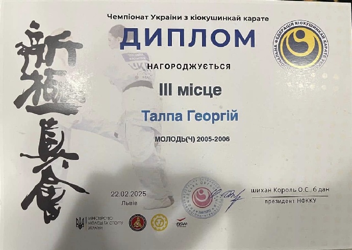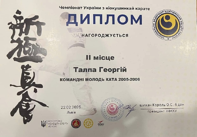 Студент 1 курсу факультету фізичного виховання, групи ФК24Б першого (бакалаврського) рівня спеціальності «014.11 Середня освіта (Фізична культура) та методика спортивно-масової роботи» Талпа Георгій виборов 3-тє місце в категорії «Молодь (чоловіки) 2005–2006 р. н.» у розділі «Ката», був відібраний кандидатом до команди збірної України та здобув 2-ге місце у складі команди молоді 2005–2006 р. н. у загальному заліку.
