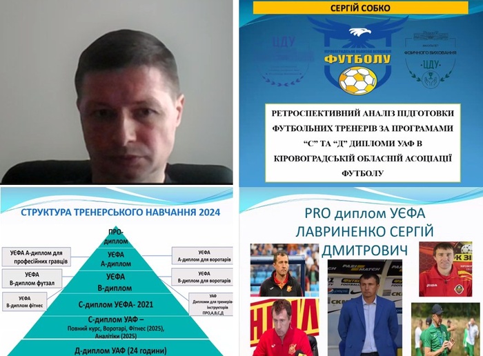 - «Ретроспективний аналіз підготовки футбольних тренерів за програмами “С” та “Д” дипломів УАФ в Кіровоградській обласній асоціації футболу» - Сергій Собко, кандидат педагогічних наук, доцент, завідувач кафедри фізичного виховання та рекреаційно-оздоровчої роботи ЦДУ ім. В. Винниченка.