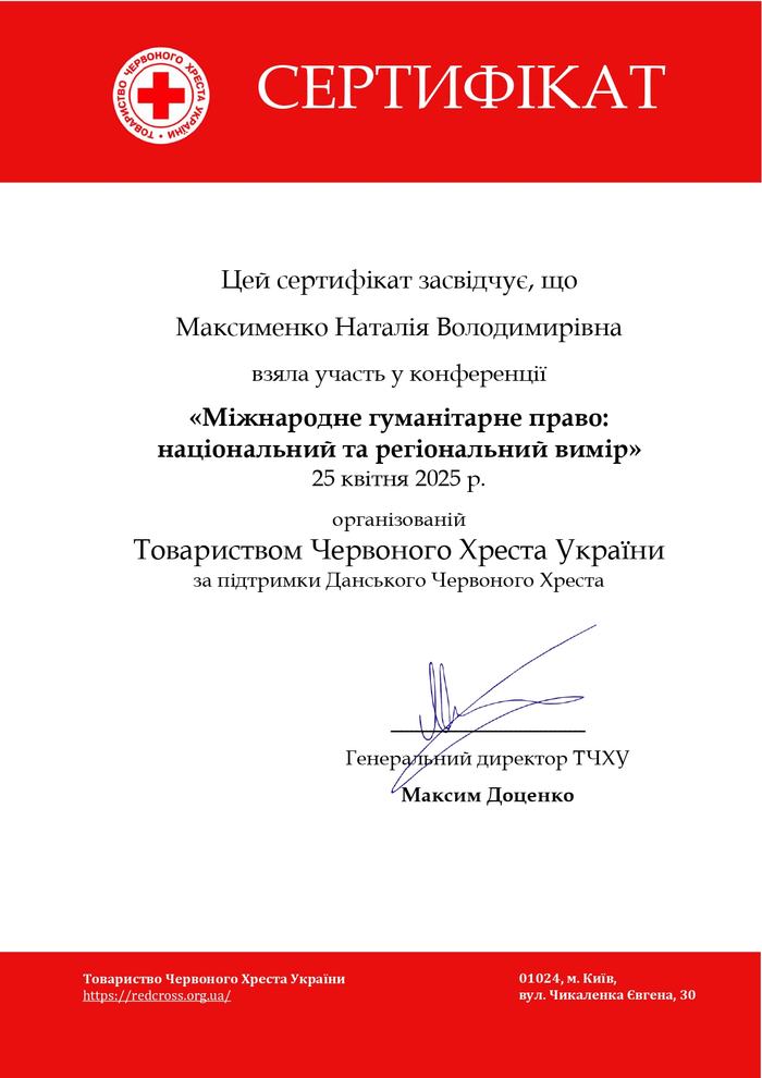 25 квітня 2025 року в Києві у змішаному форматі відбулася міжнародна конференція «Міжнародне гуманітарне право: національний та регіональний вимір», ініційована Українським Червоним Хрестом за підтримки Данського Червоного Хреста. Цей захід був проведений в рамках програми «Громадянське суспільство сприяє підвищенню стійкості в Україні» (PSPU) за фінансування МЗС Данії.