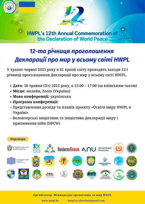 30 травня 2025 року відбувся Захід до 12-ої річниці проголошення Декларації про мир у всьому світі HWPL (онлайн-конференція в Україні).