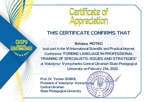 - Мотько Б. LEARNING A FOREIGN LANGUAGE WITH THE HELP OF MOVIES AND SONGS / Online Book of abstracts of the sixth International scientific and practical Internet conference “Foreing language in professional training of specialists: issues and strategies”. – Kropyvnytskyi: EPC of Volodymyr Vynnychenko Central Ukrainian State Pedagogical University, 2022. – pp. 182-185.