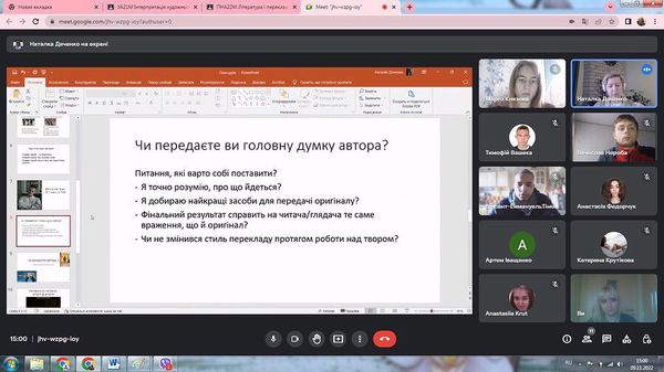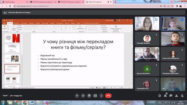 Про специфіку своєї роботи, про особливості перекладу кіносеріалів Наталка говорила з магістрантами факультету на зустрічі, що її організувала завідувачка кафедри германських мов, зарубіжної літератури та методик їхнього навчання, професорка Фока Марія.