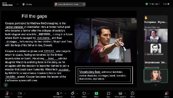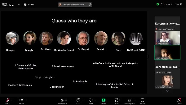 Під час онлайн-зустрічі студенти переглянули фрагменти фільму “Interstellar”, виконали цікаві інтерактивні завдання, покращили свої мовленнєві навички та обговорили важливі філософські питання. Заняття за авторською методикою Г.І. Подосиннікової проводили студенти магістратури СДПУ імені А.С. Макаренка Анастасія Сіробаба та Влада Чорна, яким вдалося створити дружню робочу атмосферу.