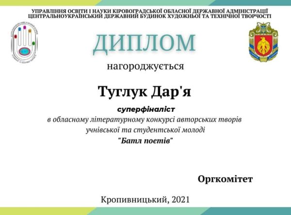 Дар’я давно захоплюється написанням власної поезії, тому, не дивлячись на те, що конкурс проходив на платформі Zoom, емоції її переповнювали. У відбірковому турі вона познайомилась з талановитими молодими авторами Кіровоградщини і пройшла до суперфіналу. Там вона виступала перед глядацькою аудиторією та членами журі. Наша студентка отримала диплом суперфіналістки й окрилена далі писати власну поезію. Вітаємо!!