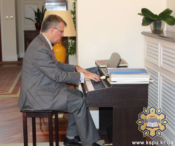 На цій позитивній ноті ми завершили розмову. Всі підвелися прощатися і тут хтось запитав про піаніно, хто на ньому грає, пан Сміт відмовив, що то пані Сміт дає концерти, але господарка будинку відхрестилася від цього. Тоді Андрій Скалкович, який зайняв 2 місце у NPSC, 2014продемонстрував свої музичні таланти. А після Саймон Сміт зіграв на піаніно для нас. Ми також сфотографувалися гуртом та залишили свої сліди у вічності —книзі відвідувань резиденції. Наприкінці зустрічі пан Сміт розказав нам, що дуже любить Київ, любить гуляти із дружиною пішки містом та насолоджуватися архітектурою столиці. Побажавши один одному гарного дня та ще раз потиснувши руки із господарями будинку, ми розпрощалися. Пан Сміт пішов далі виконувати свої обов'язки Надзвичайного і Повноважного Посла Великої Британії в Україні, а ми, натхненні та вражені, пішли гуляти Києвом або у справах.