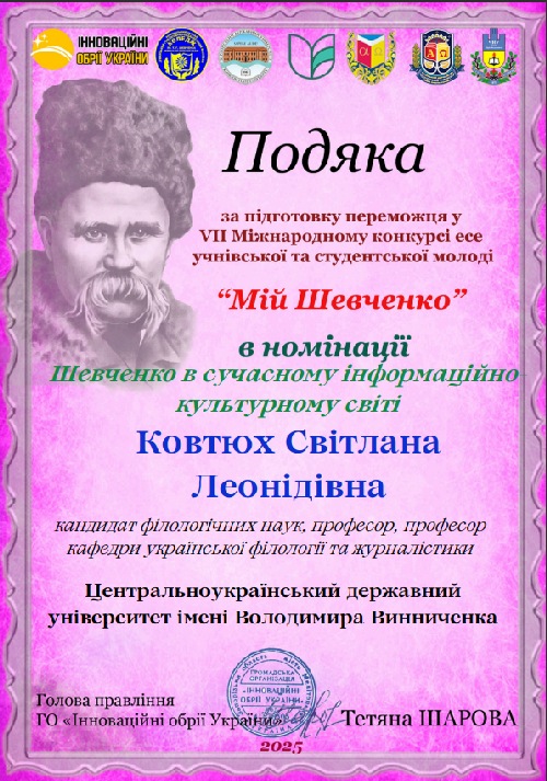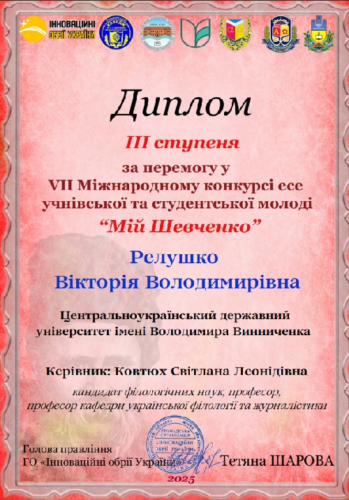 Отримали заслужені дипломи переможниць VIІ Міжнародного конкурсу есеїв учнівської та студентської молоді «Мій Шевченко» за 2025 рік учасниці лінгвістичного гуртка «Актуальні проблеми лексикології та граматики української мови» (науковий керівник – професор С.Л.Ковтюх) факультету української філології, іноземних мов та соціальних комунікацій.