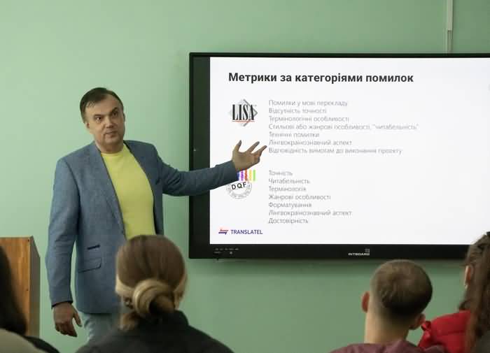 Директор компанії – доцент нашого університету – Олександр Бондаренко, член експертної групи індустрії лінгвістичних послуг (LIND Expert Group) Генерального директорату Європейської Комісії з питань письмового перекладу https://translation.ec.europa.eu/lind-group-members_en – почав виступ із інформації щодо прийдешніх заходів, організованих Директоратом, зокрема, знакового форуму “Translating Europe Forum 2025” https://commission.europa.eu/translating-europe-forum-tef/translating-europe-forum-2025-2025-11-05_en , у якому доцент нашого університету бере участь у якості модератора scene-setting панельної дискусії, присвяченої питанням якості, та спікера на панелі, присвяченій взаємодії університетів та індустрії лінгвістичних послуг. Суголосно тематиці прийдешнього форуму “Quality matters – Perspectives from across the language industry landscape” розмова зі студентами кафедри перекладу, прикладної та загальної лінгвістики була присвячена питанням якості лінгвістичного продукту та їхньої кореляції з міжнародними стандартами перекладацької та локалізаційної діяльності.