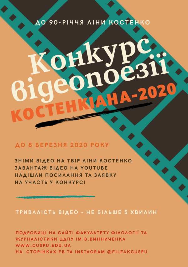 оголошує конкурс на кращий відеокліп за мотивами творів Ліни Костенко «КОСТЕНКІАНА-2020»
