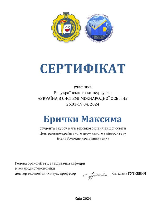 Есе студента на тему «Штучний інтелект на заняттях літератури: перспектива розвитку чи загроза регресу?», написане під керівництвом доктора філологічних наук, доцента, завідувача кафедри германських мов, зарубіжної літератури та методик їхнього навчання Марії Фоки, здобуло максимальну кількість балів, і як автор однієї з найбільш цікавих робіт Максим Бричка був запрошений взяти участь у засіданні наукового семінару «Пріоритети освітнього процесу ЄС» 17 квітня 2024 року.