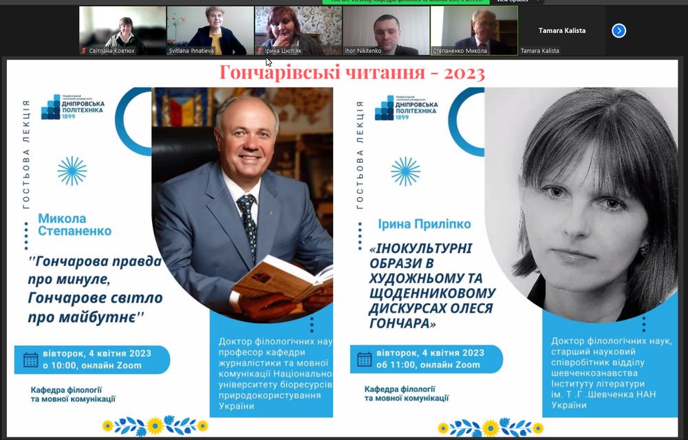 4 квітня 2023 року аспіранти та учасники наукового гуртка «Актуальні проблеми лексикології та граматики української мови» факультету української філології, іноземних мов та соціальних комунікацій узяли участь у Всеукраїнських Гончарівських читаннях – 2023, організованих кафедрою філології та мовної комунікації Національного технічного університету «Дніпровська політехніка», з якою нас поєднують давні й плідні взаємозв’язки. Цьогорічна конференція присвячена 105-й річниці з дня народження відомого українського письменника, громадського діяча, Героя України Олеся Терентійовича Гончара.