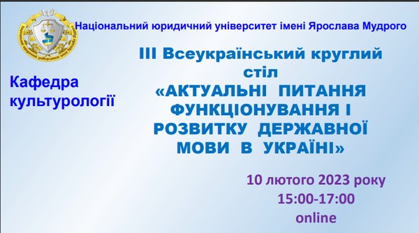 10 лютого 2023 року прогресивні сили мовознавчого сектору кафедри української філології та журналістики взяли участь у ІІІ Всеукраїнському круглому столі «Актуальні питання функціонування і розвитку державної мови в Україні», організованому кафедрою культурології Національного юридичного університету імені Ярослава Мудрого (м. Харків). Воістину харків’яни – мужні люди.