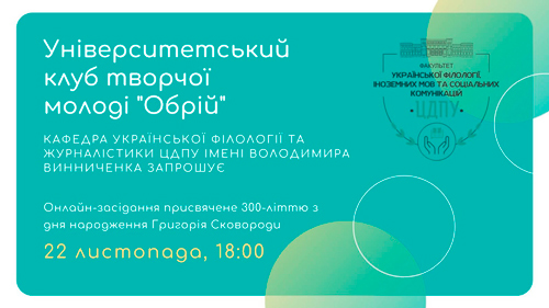 22 листопада 2022 року на факультеті української філології, іноземних мов та соціальних комунікацій до 300-ліття з дня народження філософа, поета, педагога, «українського Сократа» Григорія Сковороди, відбулось чергове засідання університетського клубу творчої молоді «ОБРІЙ».