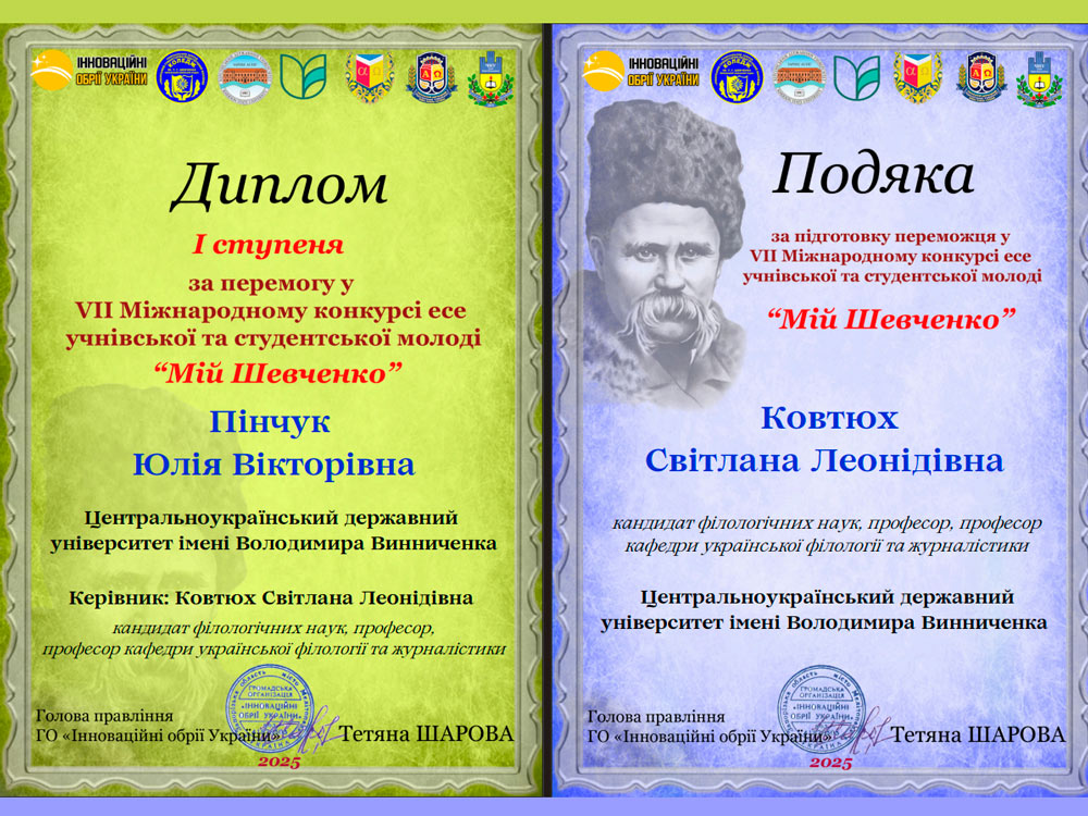 Отримали заслужені дипломи переможниць VIІ Міжнародного конкурсу есеїв учнівської та студентської молоді «Мій Шевченко» за 2025 рік учасниці лінгвістичного гуртка «Актуальні проблеми лексикології та граматики української мови» (науковий керівник – професор С.Л.Ковтюх) факультету української філології, іноземних мов та соціальних комунікацій.