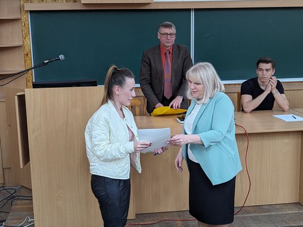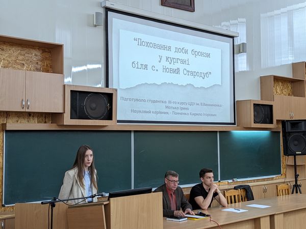 студентка ІІІ курсу першого (бакалаврського) рівня вищої освіти факультету історії, бізнес-освіти та права Мотько Ірина – «Поховання доби бронзи у кургані біля села Новий Стародуб» (науковий керівник ‒ викладач Панченко Кирило Ігорович);