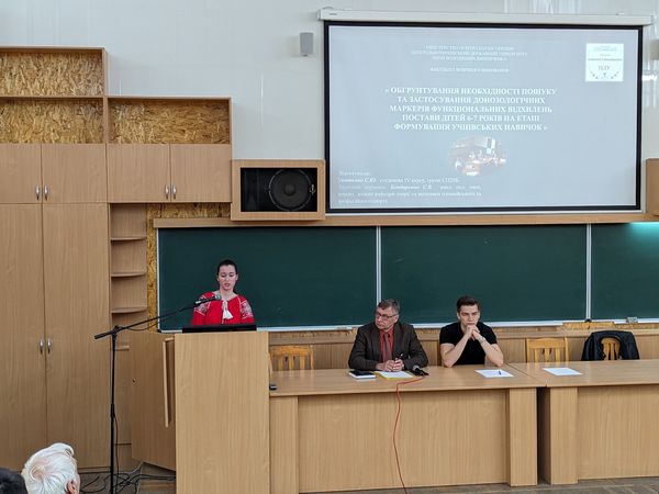 студентка ІV курсу першого (бакалаврського) рівня вищої освіти факультету фізичного виховання Ігнатенко Софія – «Пошук та обґрунтування ефективності застосування донозологічних маркерів функціональних відхилень у формуванні постави учнів 6-7 років» (науковий керівник – кандидат педагогічних наук, доцент Бондаренко Сергій Васильович);