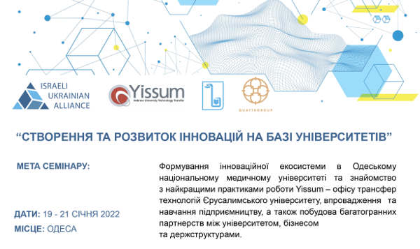 19 – 21 січня 2022 року відбудеться освітній семінар на тему “Створення та розвиток інновацій на базі університетів”. Організаторами семінару виступають міжнародна організація “Ізраїльсько-український альянс” спільно з компанією “Yissum” (офіс трансфер технологій Єрусалимського університету) та Одеським національним медичним університетом.