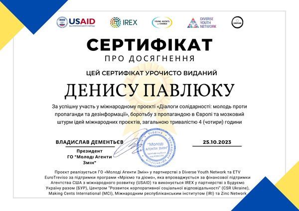 Денис Павлюк висловив переконаність, що цей спільний проєкт не лише допоможе зміцнити сприйняття правдивої інформації в українському, італійському та угорському суспільствах, але й стане прикладом співпраці між молоддю з різних країн в боротьбі з глобальним викликом пропаганди та фейкових новин.